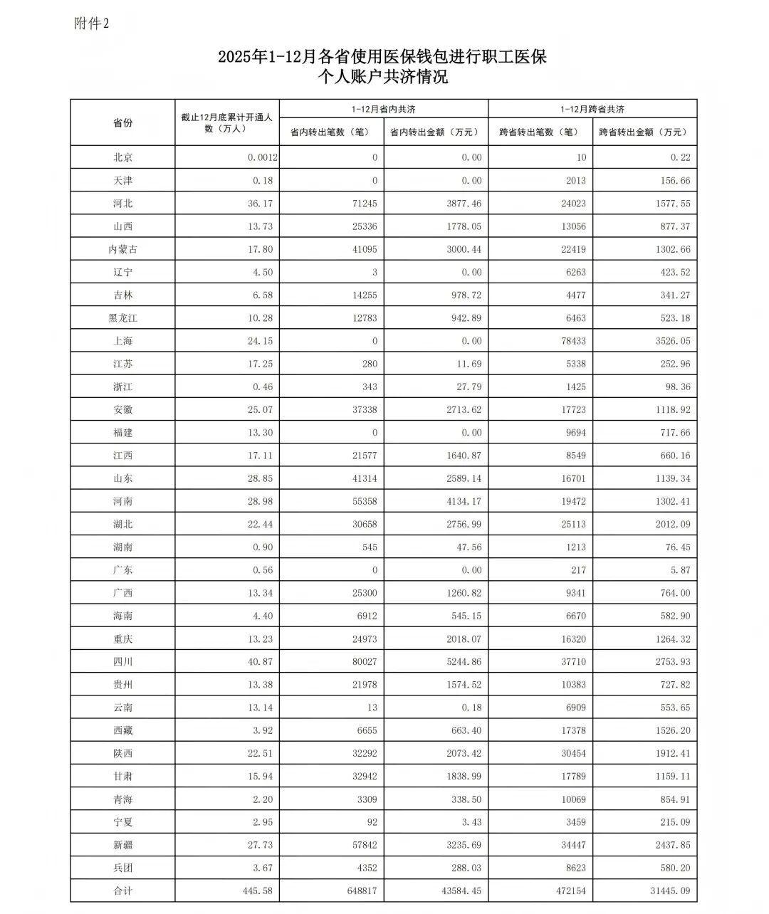 记者从国家医保局了解到,目前,职工医保个人账户共济可以通过即时调用被绑定人个人账户、医保钱包等方式实现。2025年1-12月职工医保个人账户共济人次4.64亿,金额687.7亿元。一、通过即时调用被绑定人个人账户方式进行职工医保个人账户省内共济情况2025年1-12月,通过即时调用被绑定人个人账户方式进行职工医保个人账户省内共济的人次4.63亿,共济金额680.20亿元。从共济地域看,同一统筹区(通常是同一个地市)内共济4.21亿人次,共济金额600.82亿元;省内跨统筹区共济4173.51万人次,共济金额79.38亿元。从共济用途看,用于支付在定点医疗机构就医发生的个人负担的医疗费用488.38亿元,用于支付在定点零售药店发生的个人负担的费用34.32亿元,用于参加居民基本医保等的个人缴费142.27亿元,用于支付长期护理保险的个人缴费0.76亿元,用于其他用途14.48亿元。二、通过医保钱包进行职工医保个人账户共济情况2025年1-12月,通过医保钱包进行职工医保个人账户共济共112.10万笔,共济金额7.50亿元。从共济地域看,省内共济64.88万笔,共济金额4.36亿元;跨省共济47.22万笔,共济金额3.14亿元。