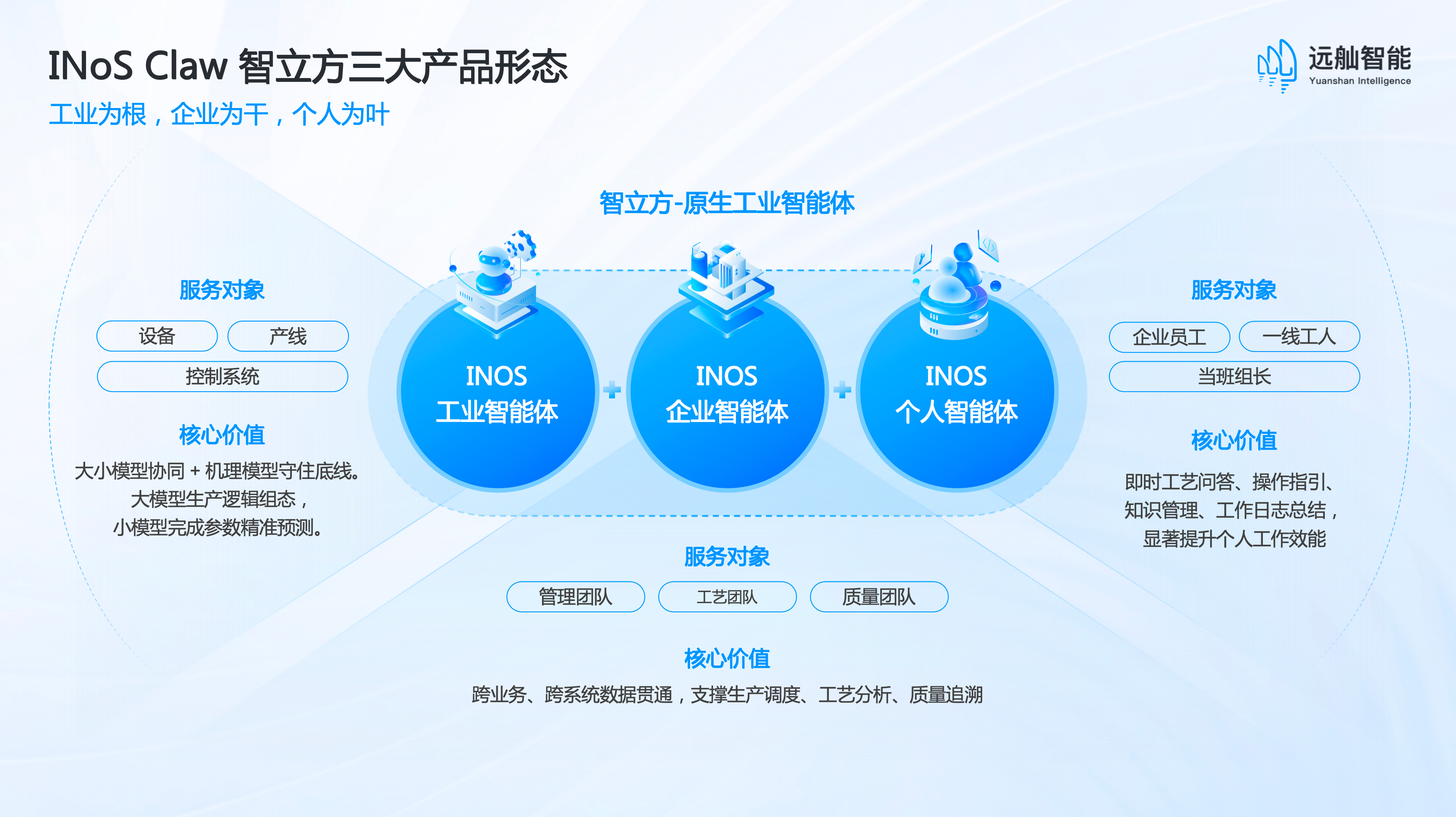 作为国产工业AI领军企业,远舢智能深耕工业智造多年,始终坚持“从工业现场出发、为工业现场而生”的产品理念。此次发布的INOS Claw智立方,并非通用智能体的简单迁移,而是基于远舢OS工业操作系统深度定制的专业级智能体,具备“能懂、会想、能干”三大核心能力。该产品基于多模态感知与知识增强来读懂现场,通过逻辑推理与自主规划优化决策,精准控制与自主执行直达设备,可真正实现AI决策对物理世界的可靠干预。