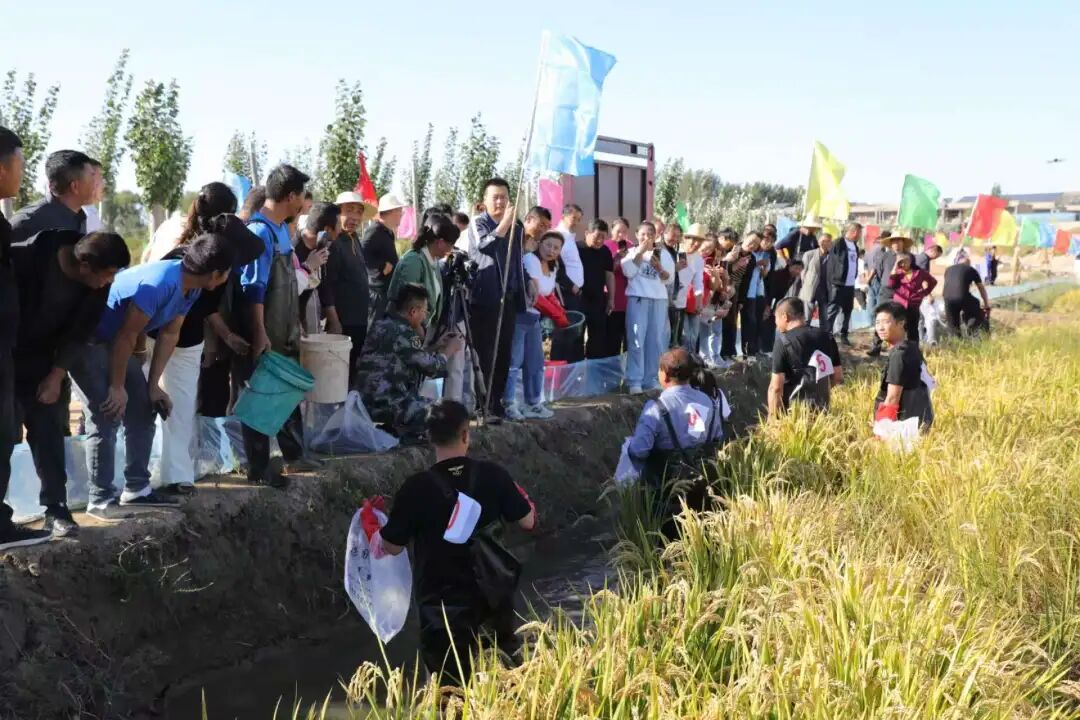水稻开镰仪式上,大家手持镰刀步入田间,左手揽稻,右手挥镰,动作娴熟利落,稻秆轻响间,一束束饱满的稻穗应声倒下。镰刀挥舞的沙沙声与欢声笑语交织,奏响丰收的序曲。这片曾是盐碱荒滩的土地,如今已成为名副其实的“塞上粮仓”。