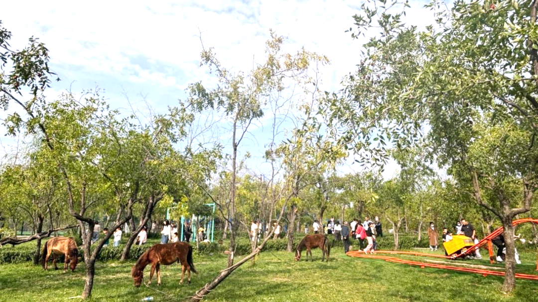 钻进一望无际的枣林,红彤彤的枣子挂满枝头,游客们踮脚、伸手,摘下一颗塞进嘴里,脆甜的汁水在舌尖炸开;游乐区里,孩子们的欢笑声此起彼伏,荡秋千的飞得老高,开赛车的转得飞快,骑马的小脸上满是得意。