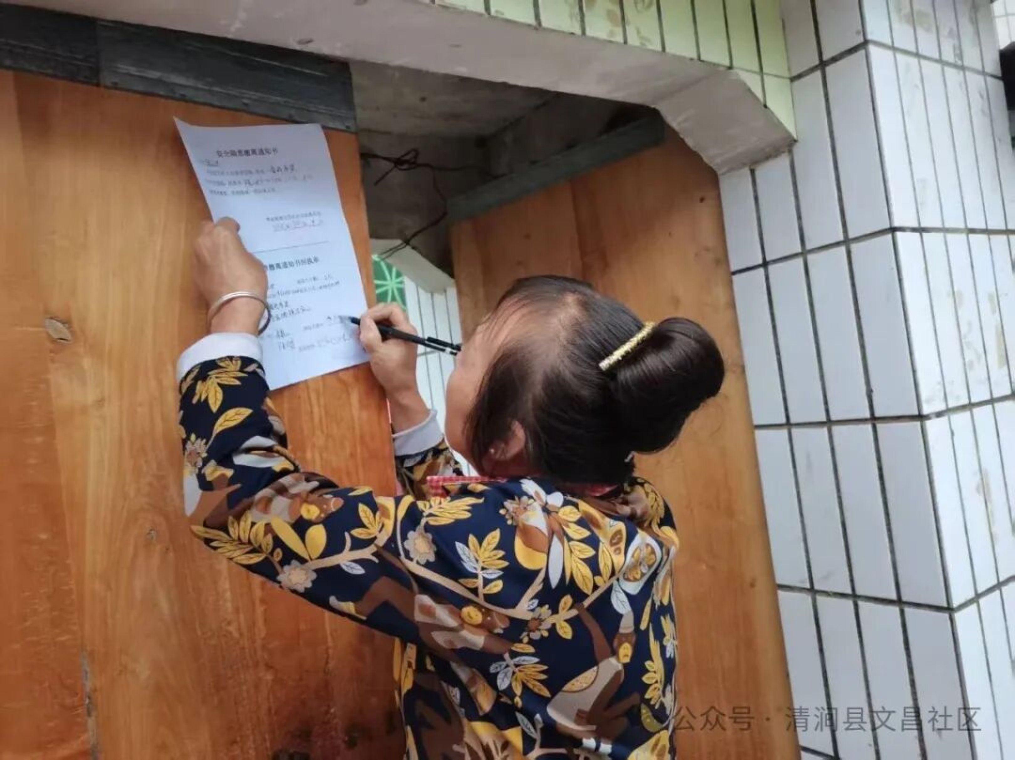 会后,社区工作人员迅速分组下沉网格,以“分片包干、责任到人”的方式推进工作:各组工作人员逐户敲门排查安全隐患,向居民详解避险要点,现场检查阳台易坠物、燃气阀门安全;对于不在家的住户,便将撤离通知书贴在门把手,再通过微信补送提醒。排查重点区域时,工作人员蹲查墙体渗水、徒手清理下水道杂物。针对特殊群体,他们主动帮行动不便老人打包物资、护送转移,还联系其子女视频报平安;对犹豫居民,结合防汛案例反复沟通,全程动态同步进展,以“脚步到点、服务到位”守住“不落一户、不漏一人”的底线。