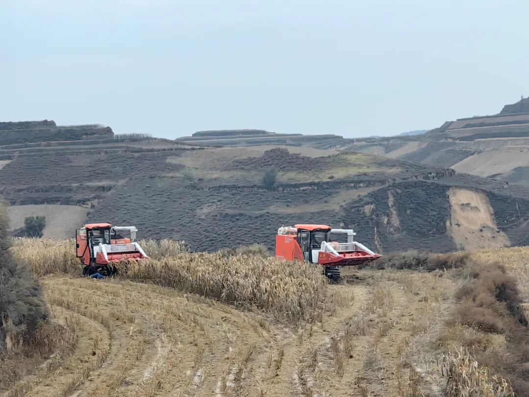 两台收割机在谷地协同收割