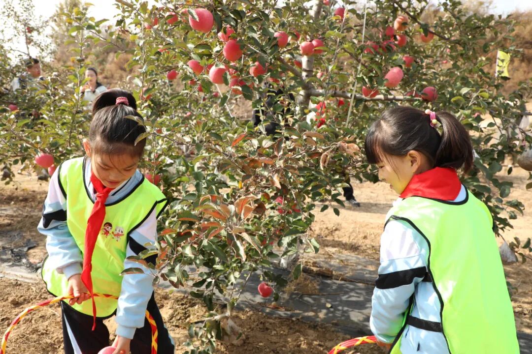 期间,红领巾助农研学活动的热闹场景格外引人注目。少先队员们分组协作,青年志愿者全程提供协助:有的仰头踮脚采摘枝头高处的果实,有的俯身拾取低处的苹果,还有的专注将沉甸甸的果实整齐装入竹篮。果园里,忙碌的身影穿梭不息,欢快的笑声此起彼伏,大家沉浸式体验着农耕劳作的别样乐趣。