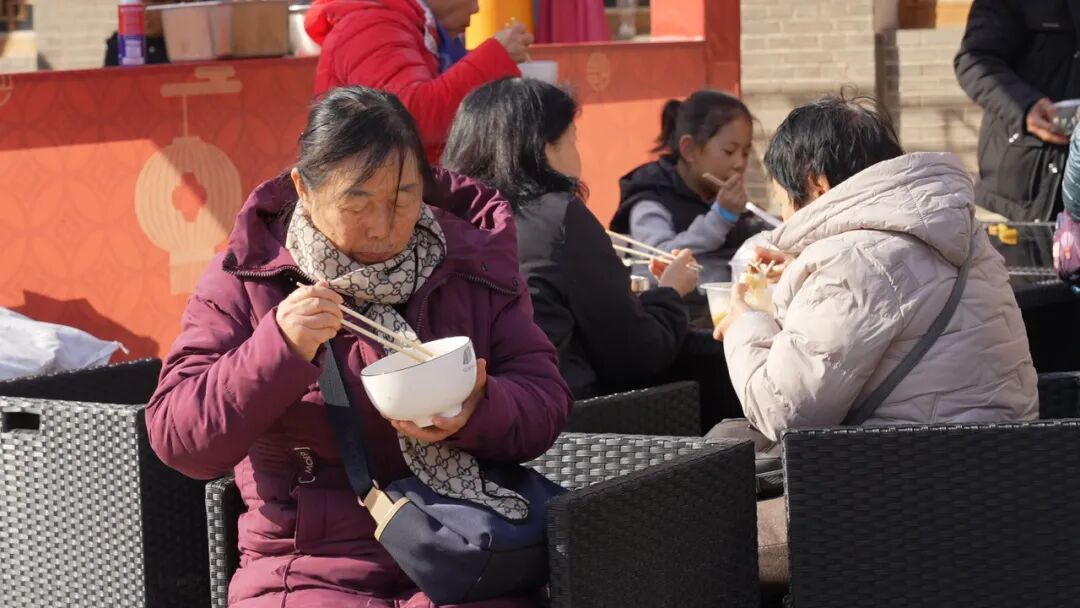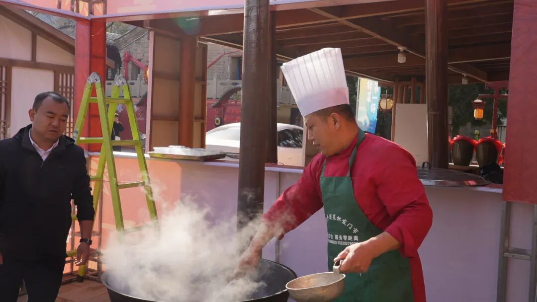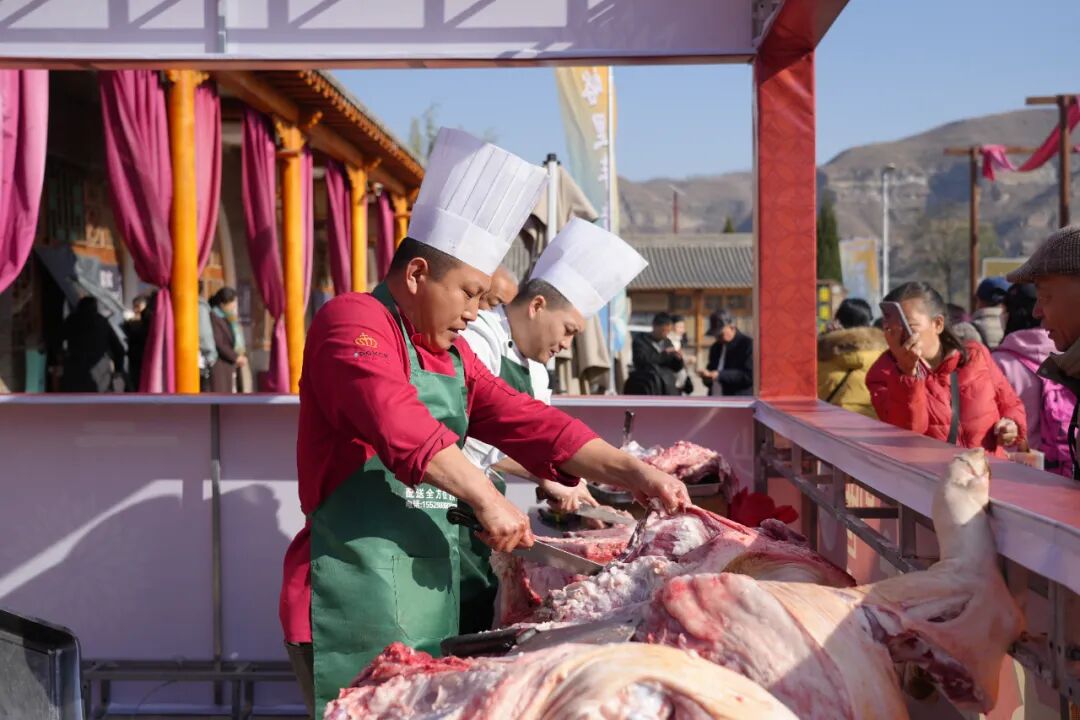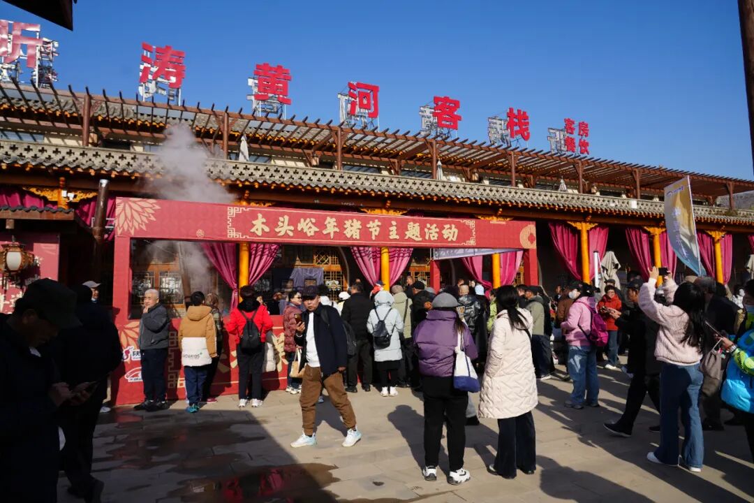 当日上午,木头峪景区人头攒动,热闹非凡。三百多斤的年猪头戴红花沿古镇巡游,引得游客纷纷驻足拍照、欢呼喝彩。随后,热气腾腾的陕北杀猪菜新鲜出锅,浓郁的肉香裹挟着烟火气弥漫全场,游客们大快朵颐,沉浸式品味民俗美食的独特魅力。