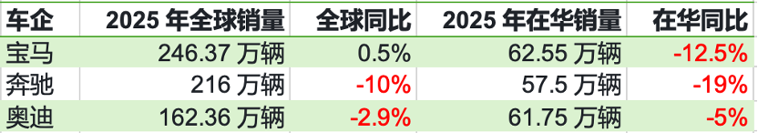 据澎湃新闻1月17日报道,近日,传统豪华车三强BBA(奔驰、宝马、奥迪)先后发布了2025年全球销量数据。数据显示,奔驰和奥迪去年全球销量均有明显下滑,仅宝马微增0.5%。具体来看,宝马以246.37万辆的全球交付量稳居三强首位,同比微增0.5%,成为唯一保持增长的品牌;奥迪全球交付162.36万辆,同比下降2.9%;奔驰表现最弱,集团全年交付216万辆,同比下滑10%,其核心乘用车板块交付180万辆,同比下滑9%,已连续六年销量走低。就中国市场的表现来看,BBA悉数下跌。其中,宝马销量最高;奔驰跌幅最大,下跌近两成。整体计算,三家车企2025年在华销量比2024年减少了约26万辆。