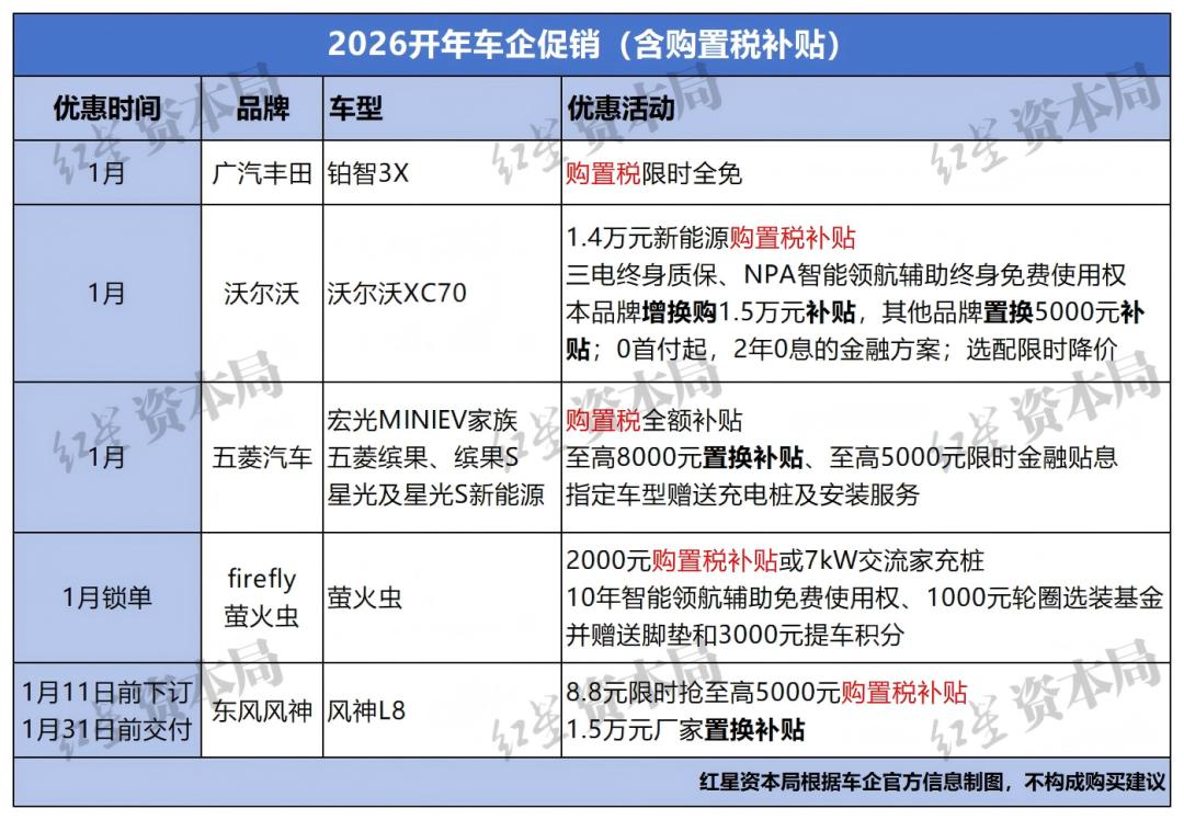 从优惠方式来看,宝马直接降价,起亚推出了一口价;5个品牌提供了新能源购置税补贴;11个品牌给予了可与国补叠加的置换/增购/报废补贴;9个品牌提供2至5年0息、低息或贴息金融政策;3个品牌推出现金相关优惠,如开年红包、定金抵扣尾款等。中汽中心资深首席专家吴松泉公开表示,2026年国内汽车市场整体增速将明显放缓。尽管近期有“两新”政策将优化实施等部分利好因素释放,但也应看到,多重因素叠加,共同加大了2026年汽车市场内需增长的压力。整体来看,汽车市场将转向高质量发展的新阶段,电动化、智能化和全球化这三条主线将愈发清晰,成为支撑市场高质量发展的核心引擎。来源:澎湃新闻、红星资本局
