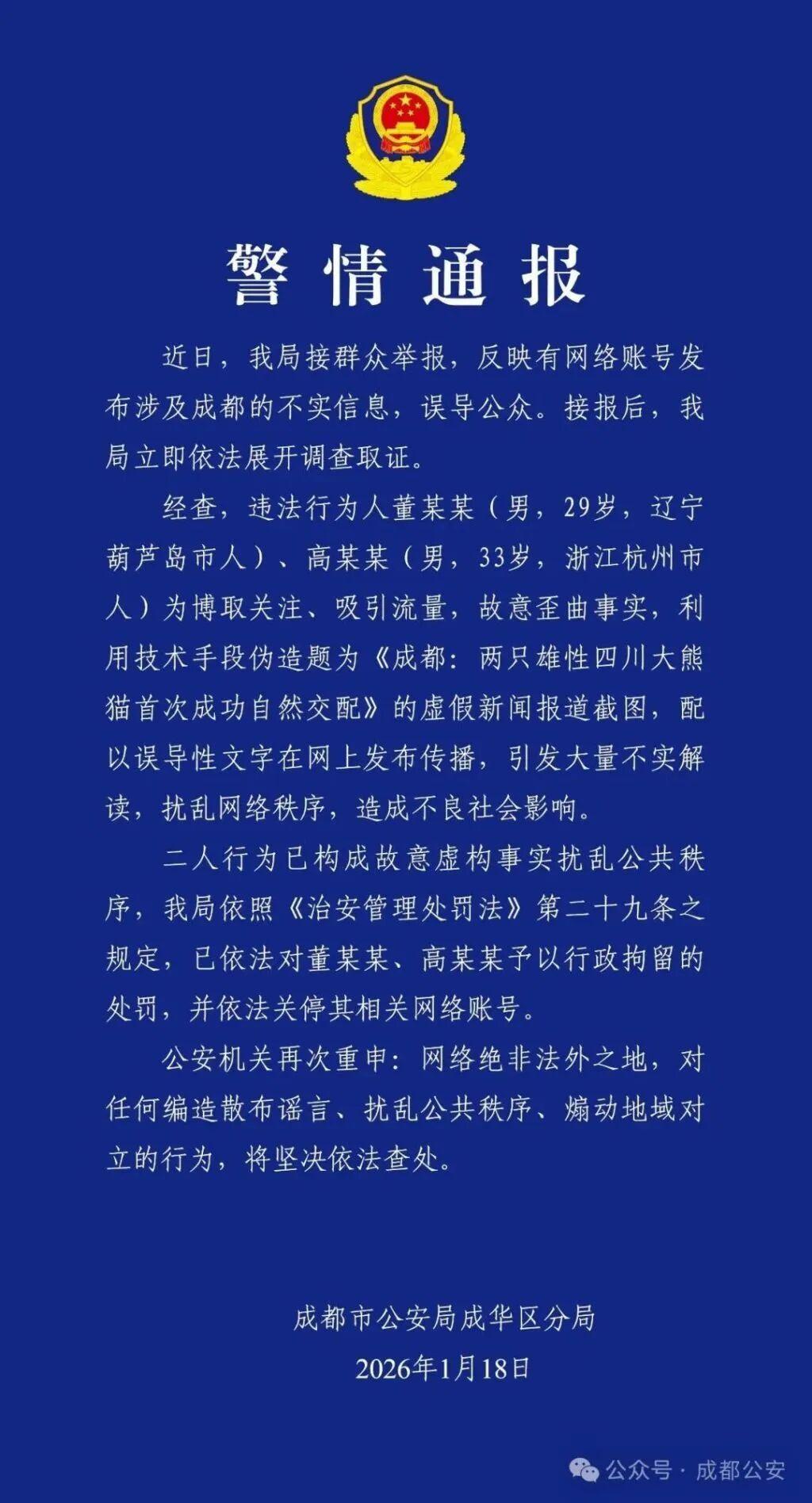 澎湃新闻记者 胥辉2026年1月18日,四川成都市公安局成华区分局发布警情通报,称两名男子为博取关注、吸引流量,故意歪曲事实,利用技术手段伪造关于熊猫的虚假新闻,造成不良社会影响。因两人行为已构成故意虚构事实扰乱公共秩序,成都警方已依法对两人予以行政拘留的处罚,并依法关停其相关网络账号。
