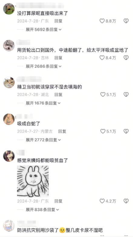 有网友调侃道:“不是你管这个叫尿不湿?你不说我以为哪来的大蟒”“点开之前我还寻思有多能吸,点开之后直接跪了!以后防洪抗灾别用沙袋了,整几皮卡尿不湿就够了”;“抗洪的时候扔俩给整成旱灾了”