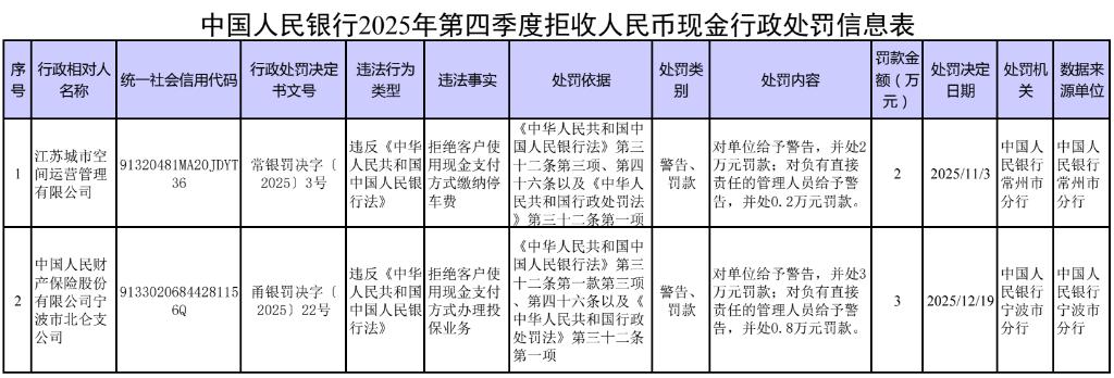 中国人民银行1月22日对外公布,2025年第四季度,中国人民银行对2家核实为拒收人民币现金的单位及相关责任人依法作出经济处罚,并予以曝光。中国人民银行发布的处罚信息显示,此次被曝光的单位是江苏城市空间运营管理有限公司、中国人民财产保险股份有限公司宁波市北仑支公司。前者是因为拒绝客户使用现金支付方式缴纳停车费被处罚,后者是因为拒绝客户使用现金支付方式办理投保业务被处罚。两家单位分别被罚款2万元、3万元。