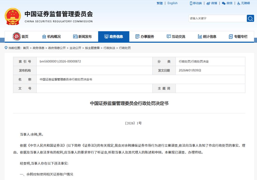 证监会官网截图如何操纵股价?一方面,其集中资金优势、持股优势连续买卖。证监会披露,操纵期间共1252个交易日,账户组在837个交易日参与交易,累计竞价买入110606468股,金额2109994422.84元,累计竞价卖出101705668股,金额2153634223.91元,买入成交量占市场成交量的比例超过10%的有181个交易日,超过20%的有45个交易日。另一方面,在自己实际控制的账户间进行证券交易。操纵期间,账户组共有212个交易日在自己实际控制的账户之间交易“博士眼镜”,成交量占市场成交量比例超过10%的有12个交易日,最高达到25.32%。经测算,余韩操纵“博士眼镜”违法所得为510892270.94元。根据当事人违法行为的事实、性质、情节与社会危害程度,依据《证券法》第一百九十二条的规定,证监会决定:没收余韩违法所得510892270.94元,并处以510892270.94元的罚款。此外,鉴于当事人操纵证券市场的违法行为情节严重,证监会对余韩采取3年证券市场禁入措施。同时,对其采取3年证券市场禁止交易措施,自证监会宣布决定之日起,在禁入期间内,不得直接或者以化名、借他人名义在证券交易场所交易上市或者挂牌的所有证券。证券监管执法的有效性和震慑力在持续强化。1月16日,中国证监会召开2026年系统工作会议提出,进一步严肃市场纪律,坚决打击财务造假、操纵价格、内幕交易等恶性违法行为,畅通行政刑事衔接机制,推动更多特别代表人诉讼、先行赔付等典型案例落地。