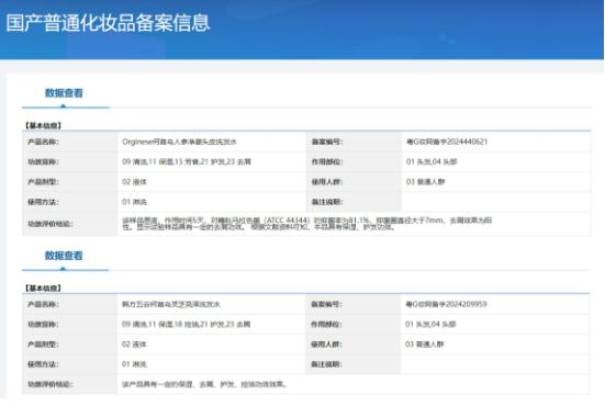 ▲Orginese欧橘旗舰店的Orginese何首乌人参净澈头皮洗发水宣称“白发冒头,一洗见效”,产品实际包装却标注“本品不具有黑发、染发效果”。该店铺直播间中,主播同样在宣称“白发洗黑”功效。新京报记者以消费者身份咨询是否真的能“白发洗黑”,主播称这款产品可“帮助促进毛囊的黑色素生成,帮助长黑发的同时能够帮助修复白发,白转黑”,并推荐记者购买2瓶或3瓶,“基本用到2瓶左右能看到非常明显的效果。”但在消费者评价晒图中,新京报记者看到,该款洗发水的包装上特别标注“本品不具有黑发、染发效果”。邓勇指出,“显老从头开始,银发频长,越愁越长”的宣传话术,属于刻意制造容貌焦虑,同时违反化妆品广告合规导向要求。北京市市场监督管理局、北京市药品监督管理局发布的《北京市化妆品广告发布指引》明确要求,化妆品广告坚决杜绝制造“容貌焦虑”类内容,该话术将“白发”与“显老”强绑定,利用消费者对衰老的恐惧心理诱导消费,是典型的焦虑式营销手段,偏离了化妆品清洁、护发的基础功能定位,通过放大外貌焦虑干扰消费者理性决策,违背了化妆品广告应秉持的健康导向原则。产品备案功效仅为清洁、保湿等依据上述两款产品的包装,新京报记者发现,两款产品均为贴牌加工产品,生产企业均在普通化妆品备案信息平台上进行了备案,但备案的功效中并不包含“白发洗黑”功效,法学专家分析认为,商家如此宣传属于超备案功效虚假宣传。从产品包装上标注的内容来看,Orginese何首乌人参净澈头皮洗发水的化妆品生产许可证为“粤妆20210162”,备案人/生产企业为芊澜生物科技(广州)有限公司(简称“芊澜生物”),产品执行的标准编号(即产品备案编号)为“粤G妆网备字2024440621”。韩方五谷何首乌灵芝亮泽洗发水包装上标注的化妆品生产许可证编号为“粤妆20161198”,生产企业为广州宝丝捷生物科技有限公司(简称“广州宝丝捷”),产品备案编号为“粤G妆网备字2024209959”。新京报记者依据备案编号在国产普通化妆品备案信息平台查询到,Orginese何首乌人参净澈头皮洗发水备案的功效为“清洁、保湿、芳香、护发、去屑”。韩方五谷何首乌灵芝亮泽洗发水备案的功效为“清洁、保湿、去屑、护发、控油”,两款产品的功效备案中均无“白发洗黑”类似功效的表述,但在商家宣传中,“白发洗黑”成为最大的卖点。