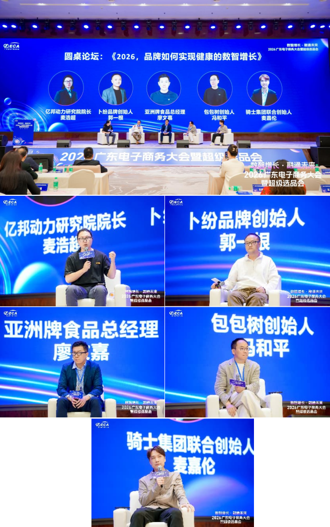 在圆桌论坛环节,亿邦动力研究院院长麦浩超担任主持人,与卜纷品牌创始人郭一根、亚洲牌食品总经理廖文嘉、包包树创始人冯和平、骑士集团联合创始人麦嘉伦共同围绕《2026,品牌如何实现健康的数智增长》展开深入探讨,从品牌建设、技术赋能、渠道创新等多个角度碰撞思想火花,凝聚行业发展共识。