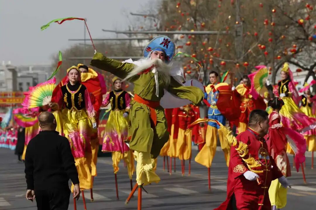 在诸多队伍中,首次亮相榆林展演的辽宁省海城高跷秧歌队无疑是最受瞩目的焦点之一。这支被誉为“踩在木棍上的东方芭蕾”的队伍一出场,便瞬间点燃了观众热情。演员们脚蹬一米多高的木跷却如履平地,身着鲜艳戏服,画着浓墨重彩的脸谱,在铿锵有力的唢呐和锣鼓伴奏下,展示着“扭、逗、浪”的高超技艺,不时做出“劈叉”“翻跟头”等惊险动作,引得现场观众阵阵惊呼。领队邢传佩表示:“这是我们第一次来榆林参加秧歌展演,榆林观众太热情了!希望用关东人的豪迈给榆林老百姓拜年。”