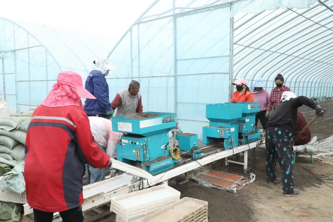 与此同时,位于上盐湾镇的伏才种植家庭农场也在进行钵体育秧,农户们分工协作、配合默契,全自动育苗机匀速作业,一盘盘营养钵整齐排列。随着大棚内自动喷淋系统定时开启,细密水雾均匀洒落,为稻种提供适宜湿度,让育苗环节更加省时省力,也最大限度保障了稻种发芽生长的均匀性。