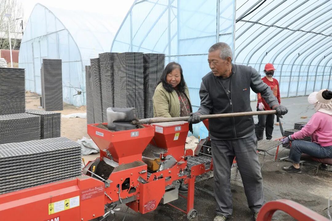 在鱼河镇四娃圆梦家庭农场,一座座温室大棚整齐排列,走进棚内,温暖湿润的空气扑面而来,培育盘内的稻种已破土而出,嫩绿的稻苗悄悄吐出新芽,长势喜人。大棚外,现代化育苗机正高速运转,在工作人员紧密配合下,送盘、装土、浇水、播种、覆土等工序一气呵成,一行行育秧盘源源不断从机器中送出,大幅提升了育苗效率。