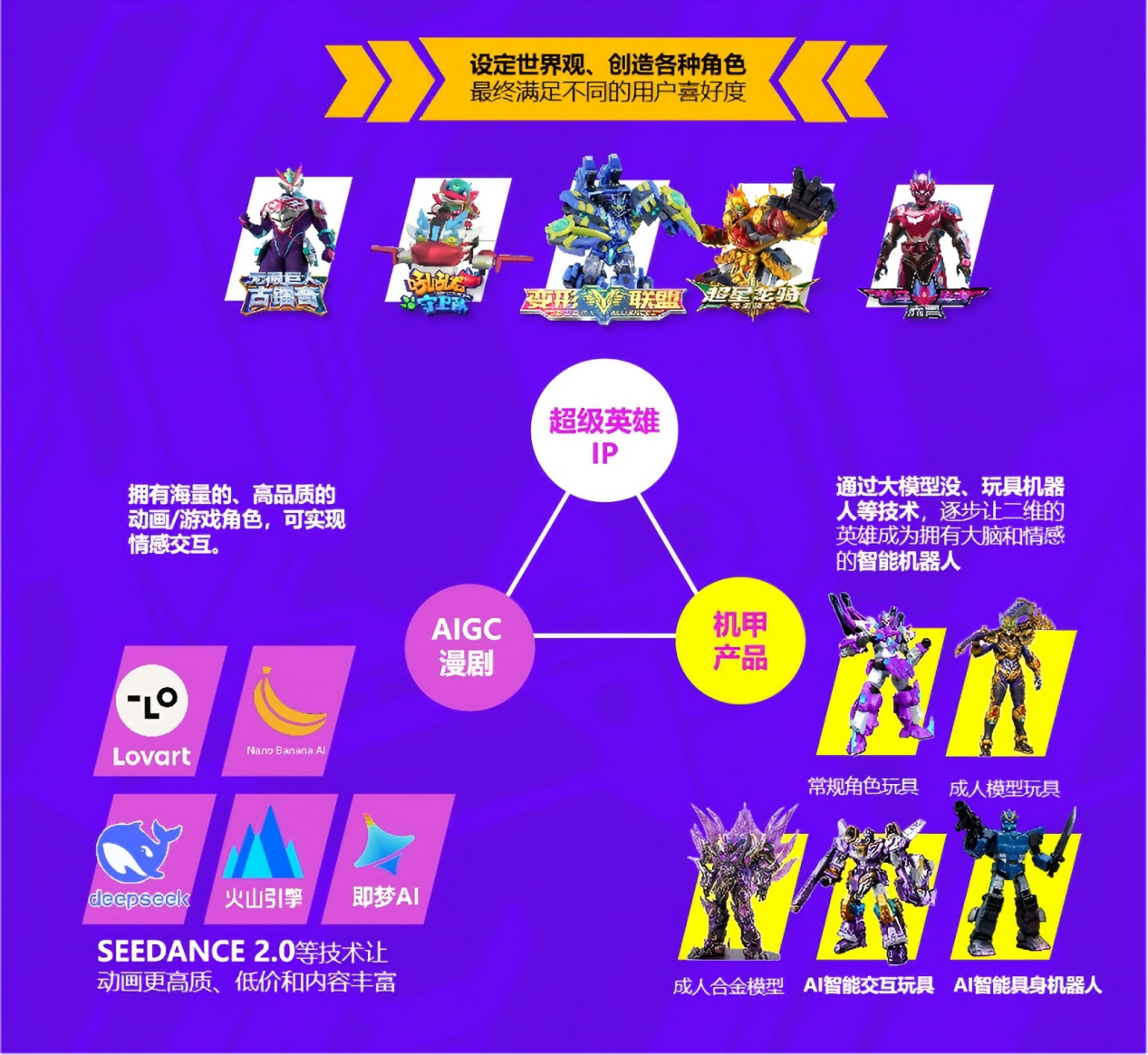 其一,AI机器人玩具。以AI超星普尔达为标杆,更多变形联盟系列角色将接入AI大模型,赋予机甲英雄“说话”的能力,让每个英雄都能与孩子展开深度互动。
